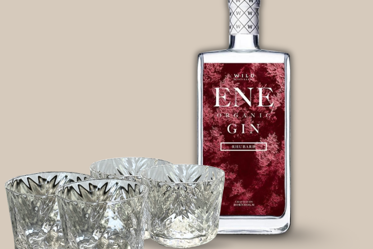 Til glassene hører ENE Rabarber Gin fra Wild Distillery – en frisk og let syrlig gin, der bringer sommeren direkte i glasset. Prøv den i en Rabarber Gin & Tonic med en sød tonic og et strejf af tørrede rabarberstængler, eller i en Rabarber Sour, hvor ginnens friske nuancer virkelig får lov at træde frem.
