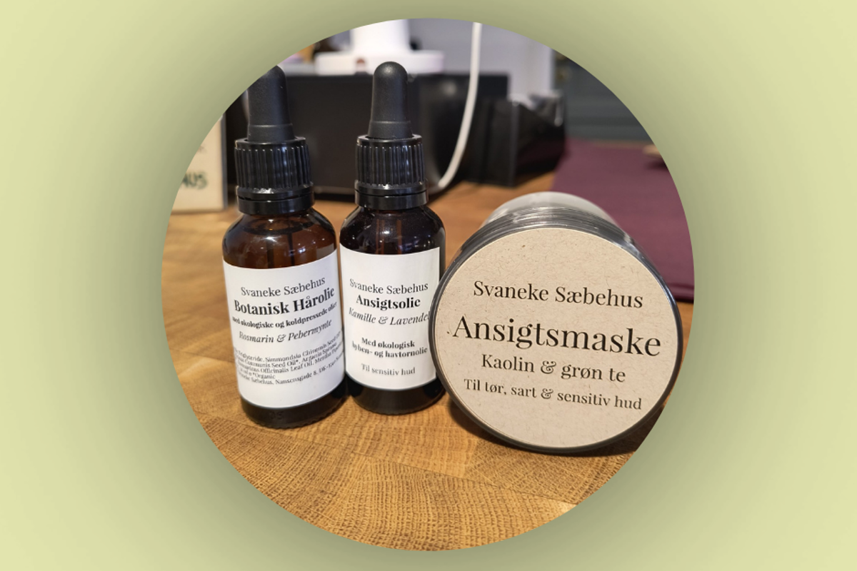 En komplet selvforkælelsespakke til ansigt og hår – håndlavet i små serier på Svaneke Sæbehus. Ansigtsmasken er baseret på ler og fine botaniske ingredienser, der renser, beroliger og giver huden ny glød.