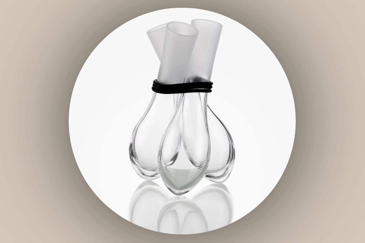 Denne mundblæste trebensvase passer til de lidt større og kraftige blomster eller tørrede grene og frøstande.