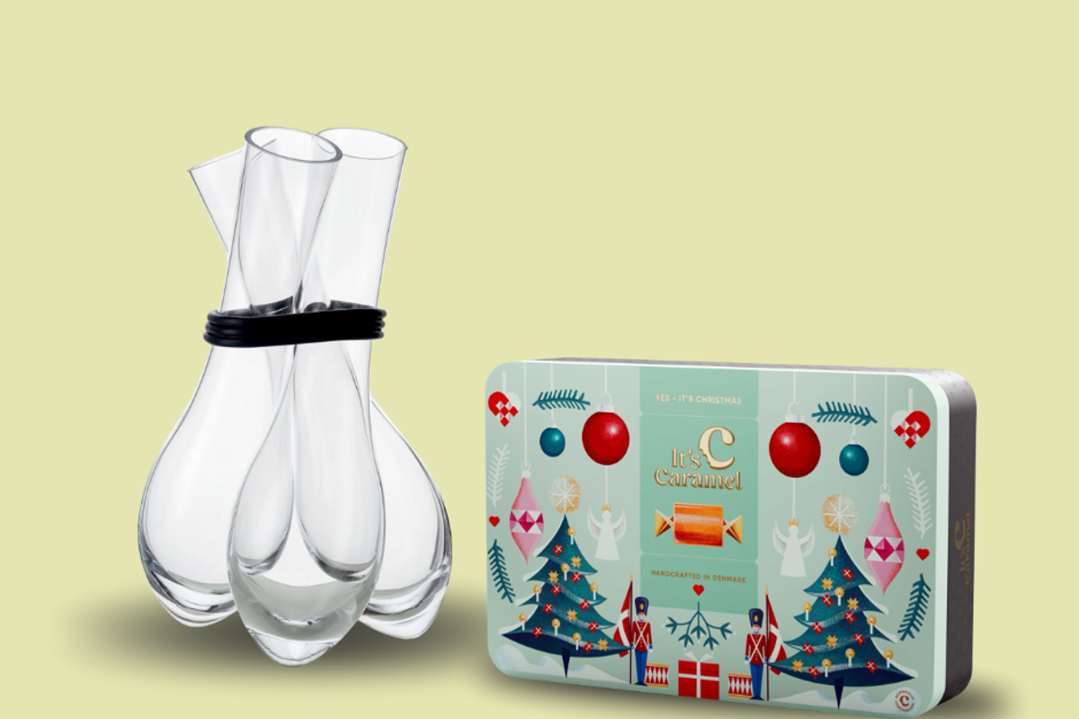 Som prikken over i’et følger den populære Mini Trebensvase fra Baltic Sea Glass med i pakken. Denne mundblæste vase, designet af Maibritt Jönsson og Pete Hunner, er både smuk og praktisk – med blot tre blomster eller grene kan der skabes flot bordpynt. Højde ca. 15 cm, diameter ca. 10 cm.