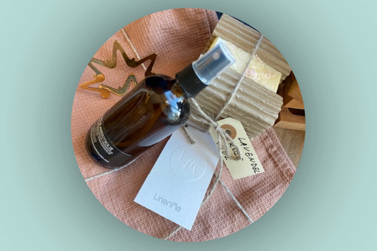 100 ml. velduftende krops- og ansigtsolie, 3 stykker lækker sæbe samt et håndklæde 50x70 i 100% hør.