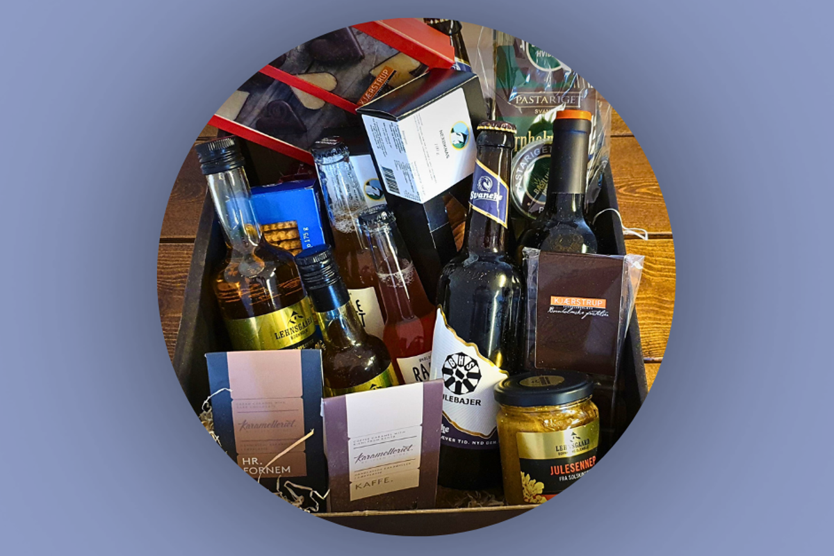 I denne finder du bl.a. Lehnsgaard olie, lækker chokolade fra Kjærstrup, bornholmske småkager fra Bager Mortensen og meget mere.