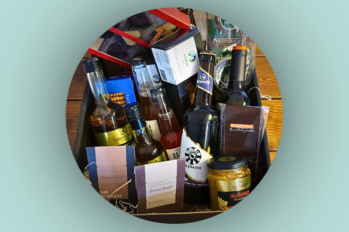 I denne finder du bl.a. Lehnsgaard olie, lækker chokolade fra Kjærstrup, bornholmske småkager fra Bager Mortensen og meget mere.