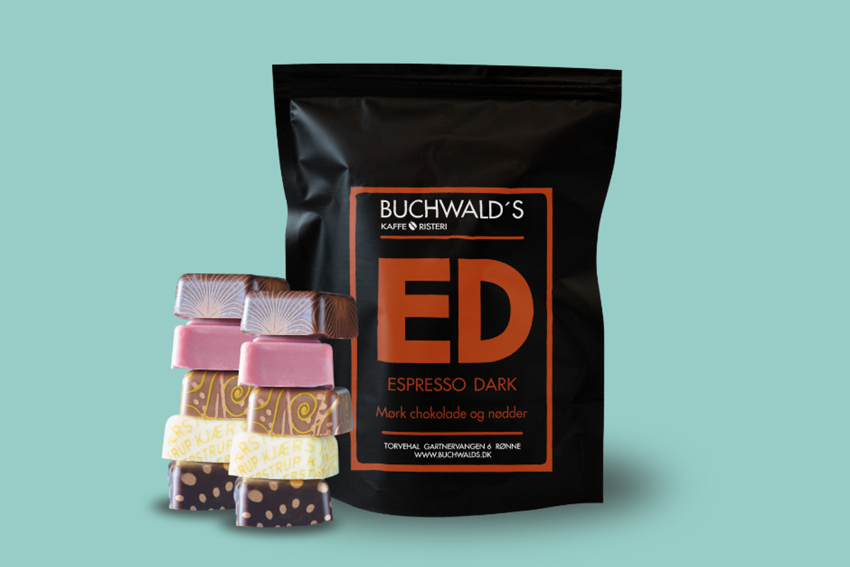 Denne eksklusive gavepakke kombinerer håndlavet chokoladeluksus med en fyldig, mørk espressooplevelse.