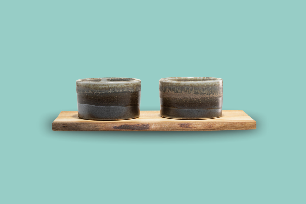 Et dekorativt lille sæt skåle på et fint forarbejdet massivt stykke træ. Sættet er oprindeligt tiltænkt salt og peber på et veldækket bord, de små skåle har dog mange muligheder - også uden brættet, fx til kuvertsmør.