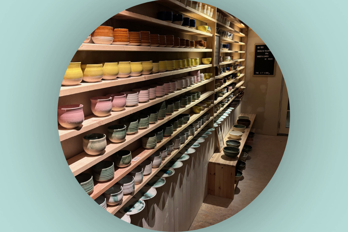 Butikken og værkstedet er et lille kreativt åndehul i Rønnes bymidte, hvor du kan opleve unikke kopper, skåle og brugsgenstande – alle formet med sans for detaljer og materialer.