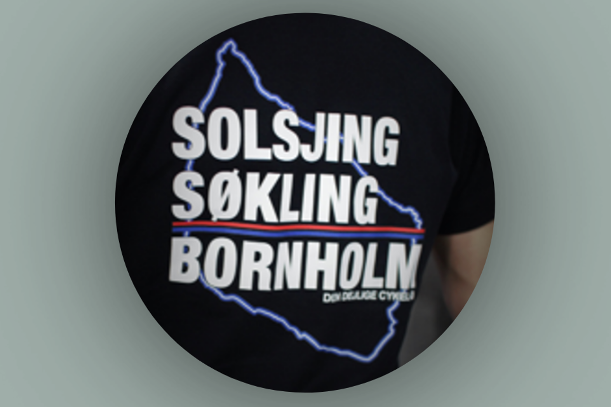 En lækker T-shirt med teksten Solsjing Søkling Bornholm med en Bornholmer-silouet i baggrunden.