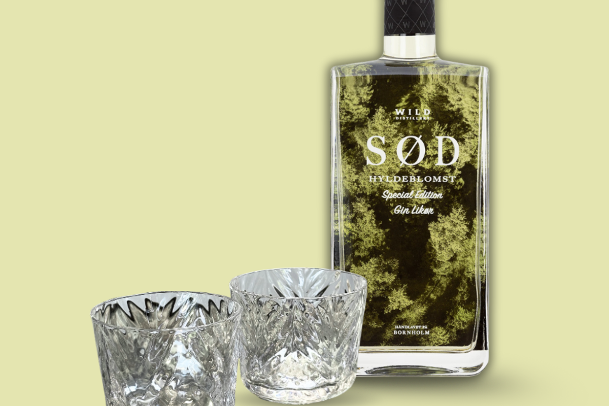 Nyd den søde Hyldeblomst Gin Likør fra Wild Distillery i de smukke Sildebens-multiglas fra Baltic Sea Glass.